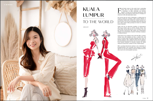 Hwi is a Kuala Lumpur, Malaysia based fashion illustrator known for her elegant watercolor and digital fashion illustrations that celebrate the beauty and personality. Her passion for art was reignited during the pandemic, inspiring her to transition from a career in insurance to fully pursuing fashion illustration. She holds a Bachelor of Arts in Psychology from Iowa State University, USA.